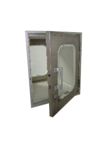 Módulos para passagem de Material com portas intertravadas eletronicamente, revestidos em melamina fenólica, aço inox ou aço carbono com pintura especial, visor duplo com vidro de cristal transparente.