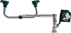 O chuveiro possui acionamento manual através da haste triangular em aço inoxidável e o lava-olhos possui acionamento através da placa empurre também em aço inoxidável.