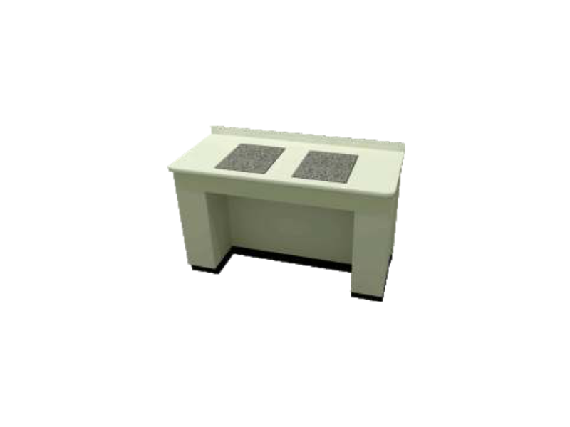 Construída em blocos de concreto de grande inércia, sendo dois blocos verticais (pés) e um horizontal (tampo). Uma ou duas pedras de granito, apoiadas sobre o tampo de concreto. Entre o tampo e os pés são instalados coxins anti vibratórios.